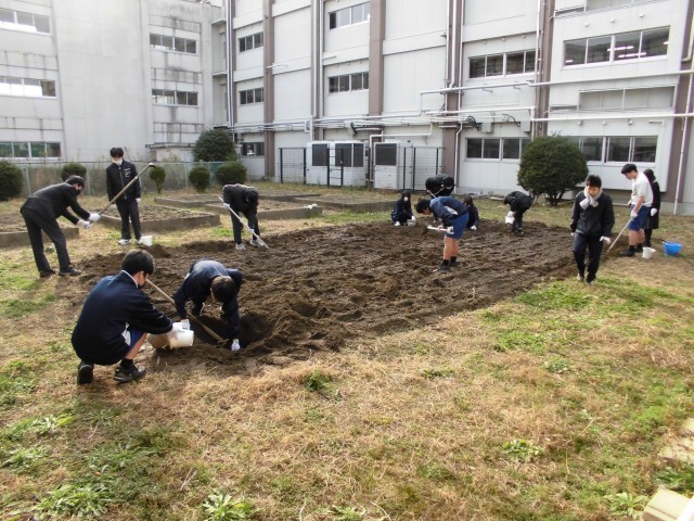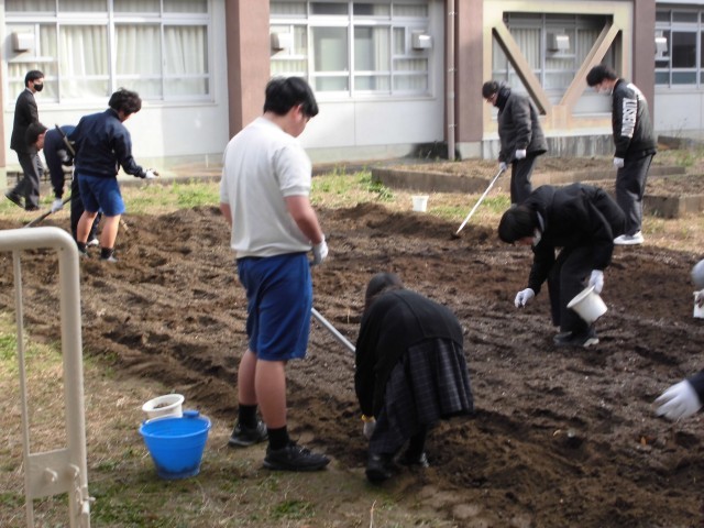 7・8組の作業の様子です。畑の土を掘り返しています。
