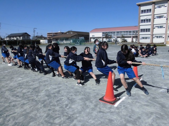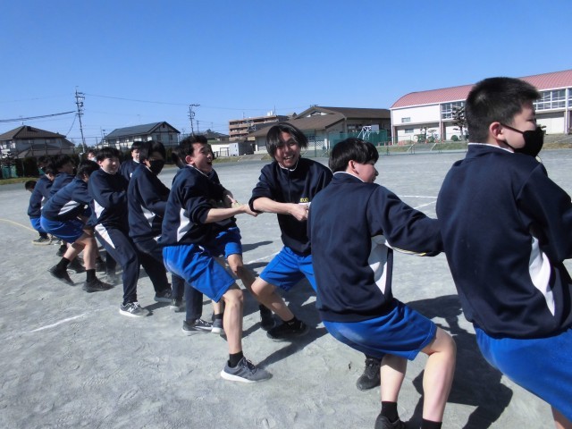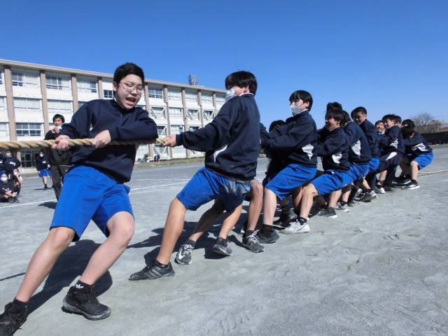 6限に2年生の学年レクがあり、綱引きを行いました。声をかけあって力いっぱい綱を引いたり仲間を応援したりと、どのクラスも全力で戦い、今年最後の学年レクを楽しんでいました。