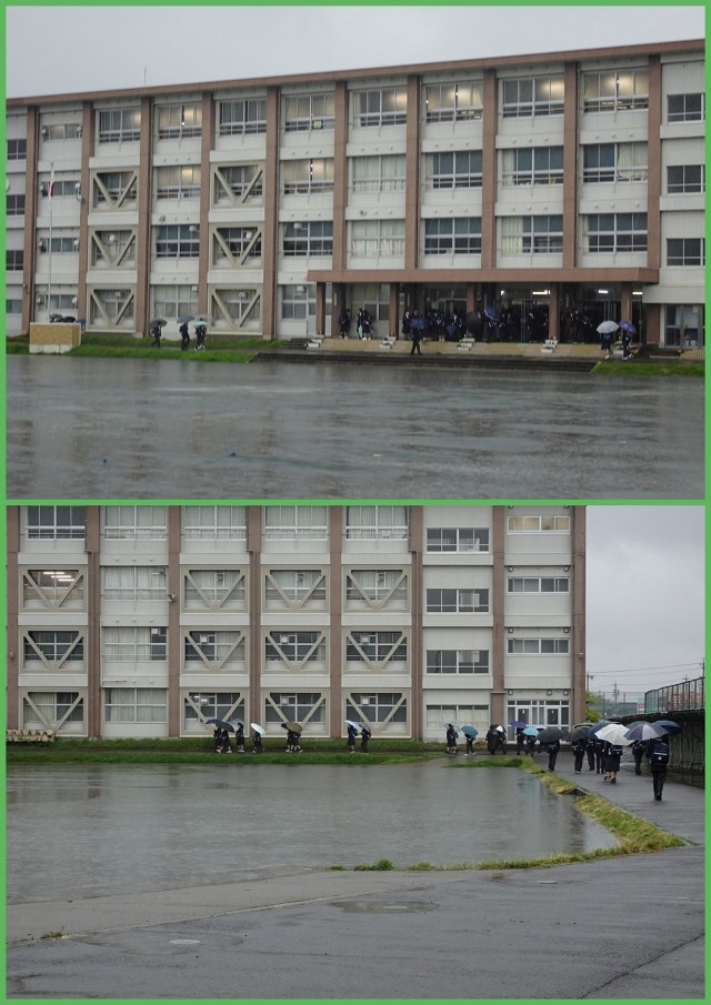 徒歩でも、傘ではなくカッパを着てくる生徒、長靴やレインシューズを履いてくる生徒がいました。