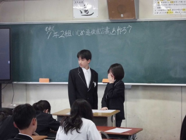 今日、1.2年生は「いじめ追放宣言書」作成に取り組みました。