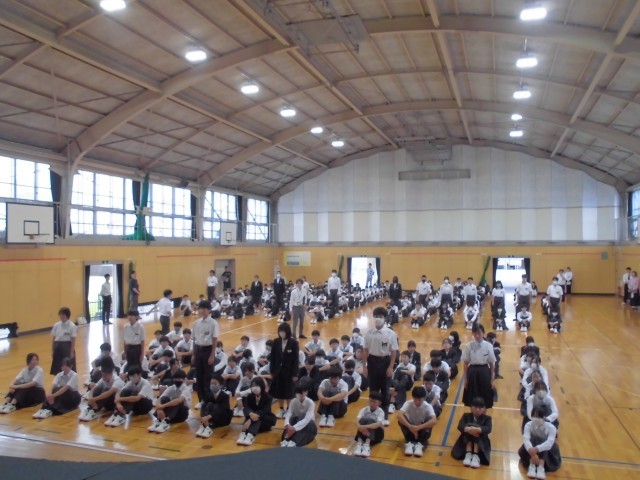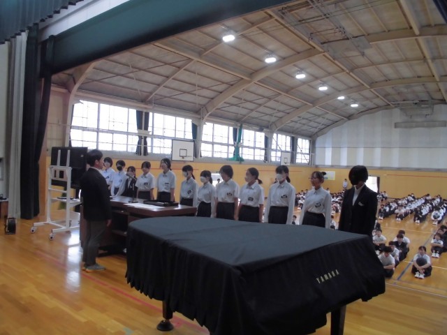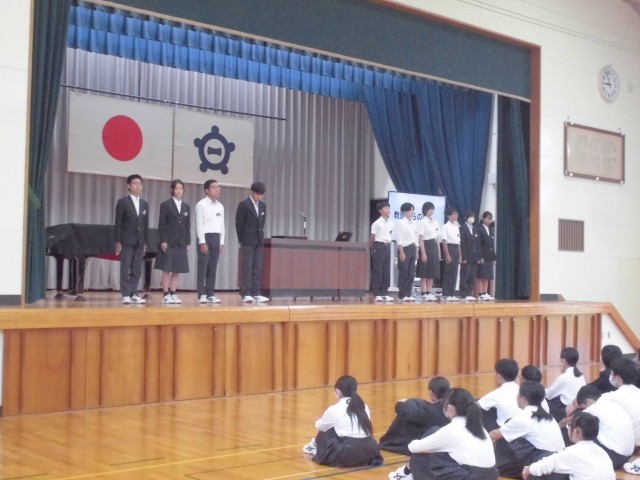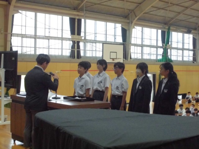 本日は、後期生徒会、学級役員、委員会委員長の任命式と、新人大会の表彰を行いました。