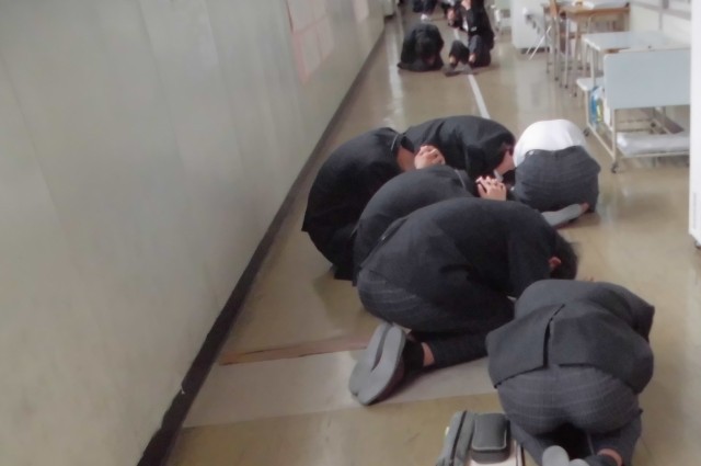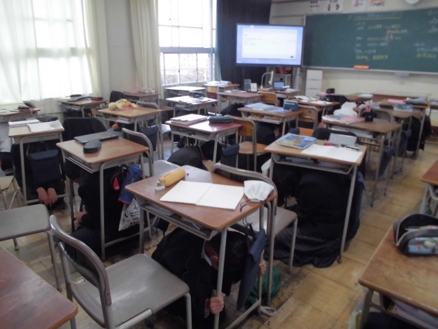 休み時間にシェイクアウト訓練を行いました。地震の際の安全確保行動「まず低く、頭を守り、動かない」を意識し訓練を行いました。