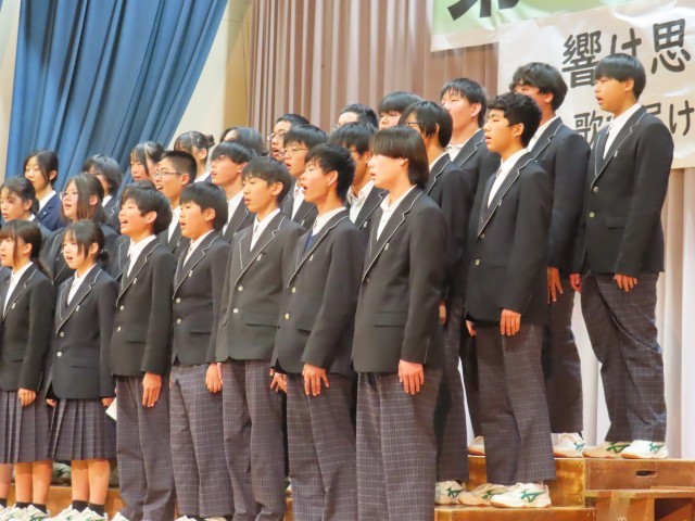 本日、本校体育館にて合唱祭が行われました。3年生にとってはクラスで臨む最後の行事。どのクラスも今日まで必死に練習してきました。3年生の曲は難しく、どのクラスもリズムや掛け合い、言葉の言い方など表現の仕方に苦戦することが多かったと思います。どうしたら声量があがるか、どうしたら歌のメッセージを伝えることができるか。本気だからこそぶつかる壁があります。しかし、歌詞の意味を考えながら、パートリーダー・指揮・伴奏の人を中心にみんなで工夫を考え、みんなで一つの歌を創り上げました。