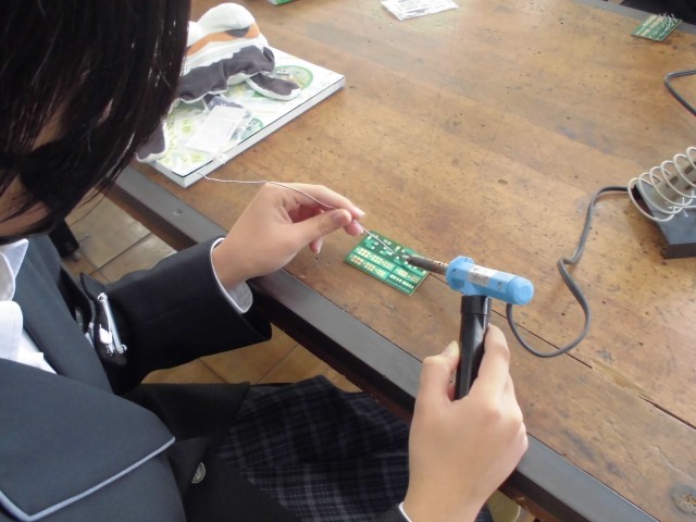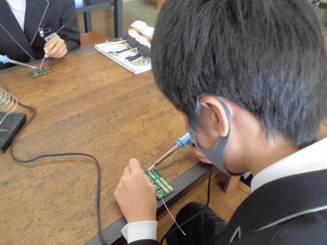 技術の授業の様子です。はんだごてを使って、リード線を基盤に接続する練習をしました。初めてのはんだづけに緊張しながらも、手順を確認して慎重に練習をしていました。