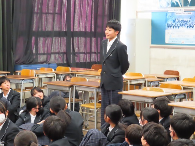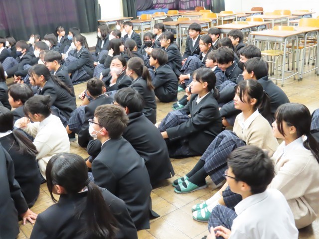 今日の学年集会では、「冬休みの過ごし方」「学習」「3年生を送る会」「福祉実践教室」「2学期の振り返り」についての話がありました。