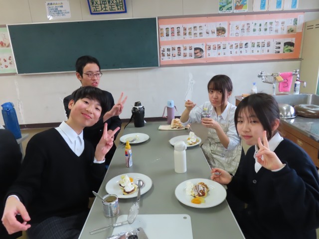 2月20日(金)思い出のパンケーキ 公開日 2026/02/20 更新日 2026/02/20 3年生の様子 今日は2組が5・6時間目の家庭科の時間にパンケーキを作りました。卒業まで残り9日となりました。3月6日(月)の卒業式に向けて、式の練習もがんばっています。 +1