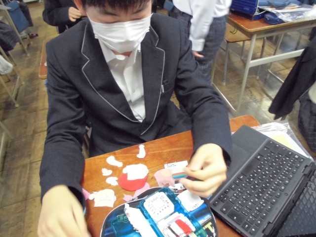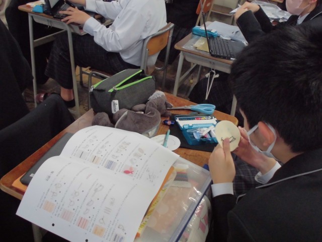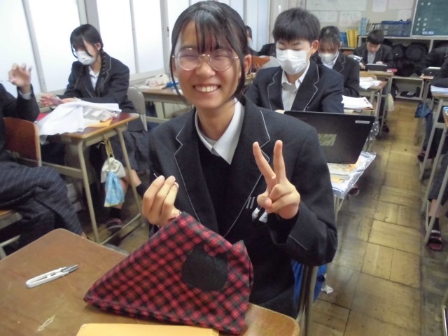 現在、家庭科の授業では「世界に一つだけのオリジナル巾着」作りに挑戦しています。