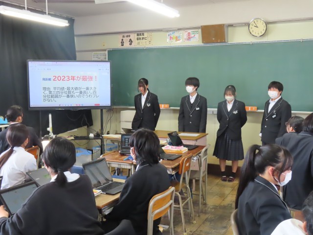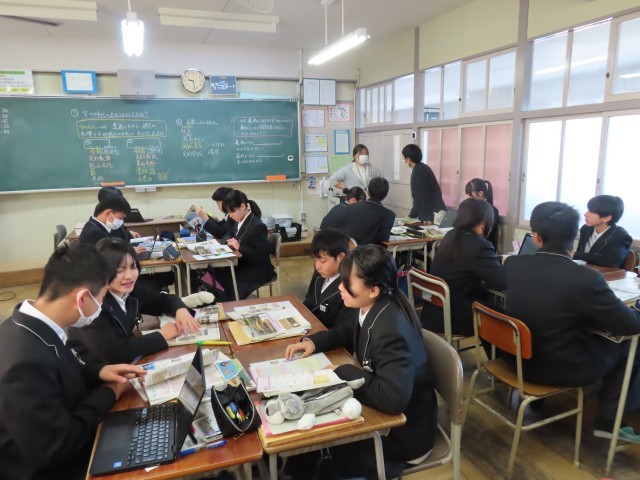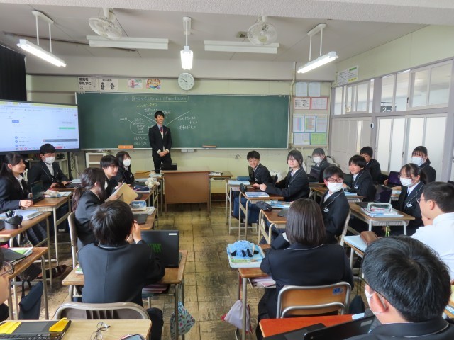 現在,先生たちの授業力向上のために「授業力アップ週間」を行っています。先生たちも来年度を見据えた授業研究をしています。「4人組でのグループ学習」,「コの字隊形での話し合いの学習」など,先生たちの新たなチャレンジが生徒たちの笑顔に繋がっていますね。