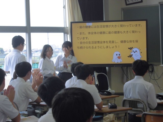 本日の朝のSTで後期保健委員の生徒が、身体測定の連絡と生活習慣について、学級で呼びかけを行いました。各クラスの保健委員で役割分担をし、緊張しながらもスライドを使って一生懸命呼びかける姿が見られました。今後もクラス内の健康リーダーとして半年間、活躍してくれることを楽しみにしています。