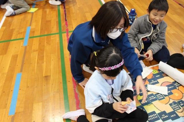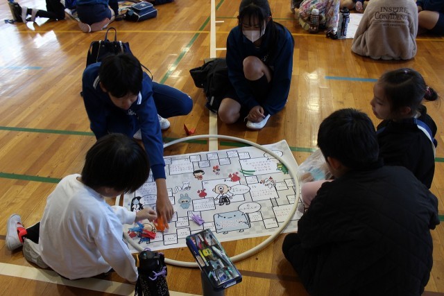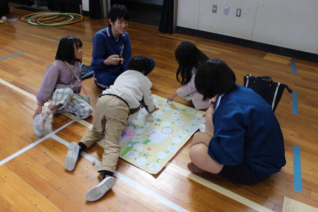 本日、小中交流会を行いました。家庭科の授業で学んだ「六角返し」や総合の時間で作成したすごろくで、小学1年生、2年生と楽しく交流することができました。