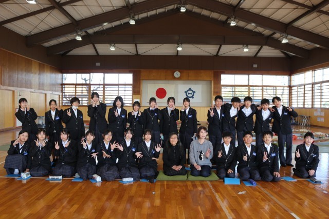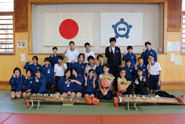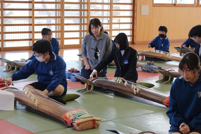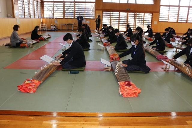 1年生の生徒たちは、音楽の授業の中で、箏の練習をしたり、箏曲を鑑賞したりする学習に取り組んできました。箏の先生をお招きしたことで、生徒たちはとても意欲的に箏の練習に取り組みました。