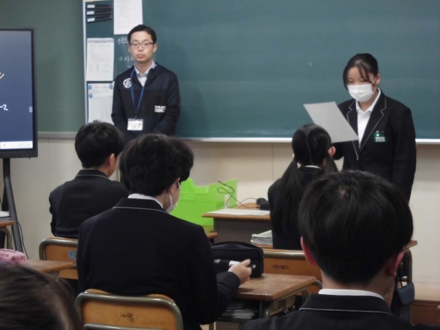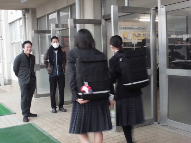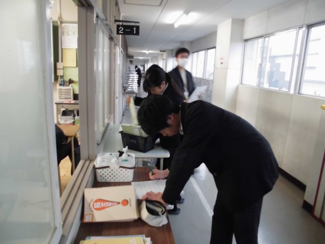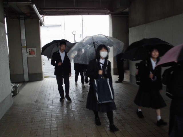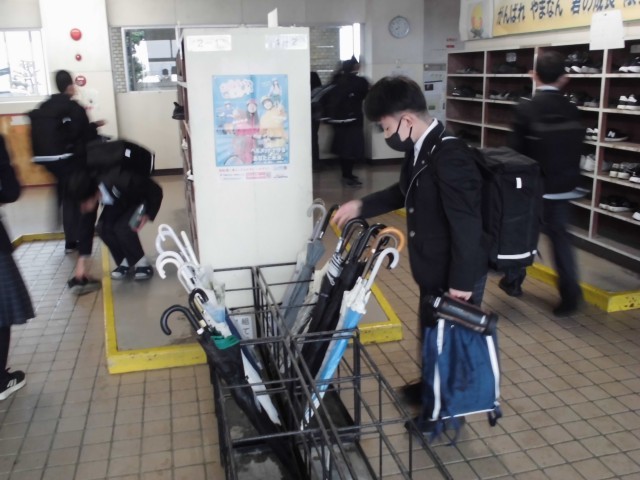 今日は雨です。徒歩通学の生徒は傘を差し、自転車通学の生徒は合羽を着て登校しています。昇降口で傘をきちんとたたみ、教室に向かいます。廊下に課題を提出し、係の生徒がチェックします。そして、朝のSTが始まります。3年生の登校は今日を含めて4日間です。明日には「卒業生を送る会」があり、今日はリハーサルがあります。