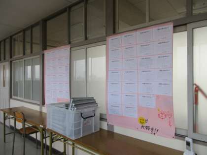 3月1日に大成功に終わった、「3年生を送る会」のお礼のメッセージを3年生から頂きました。3年生から感謝の気持ちや学校生活でのアドバイスなど、たくさんのメッセージが1年生の階の廊下に並んでいます。