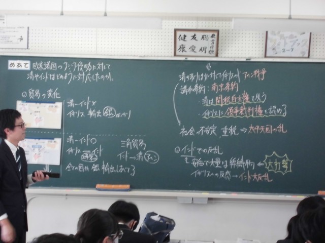 内容は、「欧米諸国のアジア侵略に対して、中国やインドはどのように対応したのか」というめあてのもと、授業が展開されました。導入では、スライドを用いて前時の復習をテンポよく行い、導入からめあてに向かう中で、船の写真を見せて「この船はどこの国のものか」という問いに対して、個やペアで考えるところから展開の流れに入っていきました。子どもたちは終始集中して授業に取り組んでいました。授業で学んだことををスライドで確認した後に、まとめをタブレット端末に入力しました。