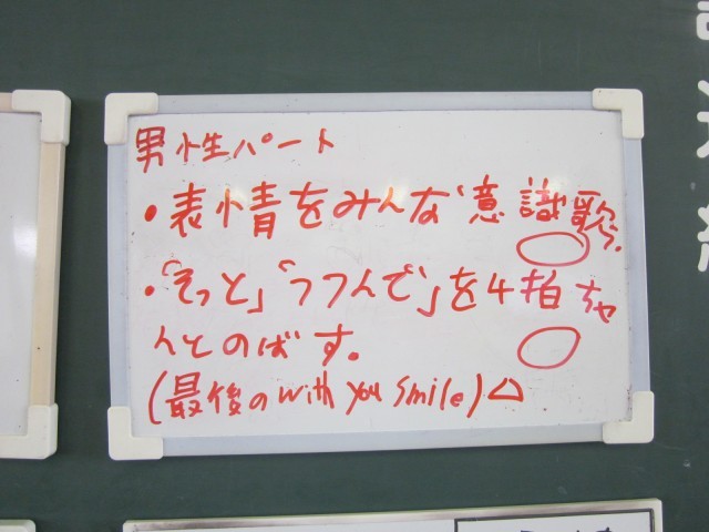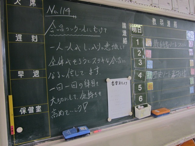 教室の飾りつけに意気込みが書かれていたり、背面黒板に担任の先生からの温かいメッセージが書かれていたり、パートリーダーからの今日の練習の目標が掲げられていたりと、合唱への意欲がそこかしこに感じられます。