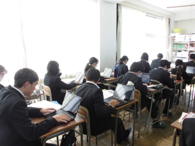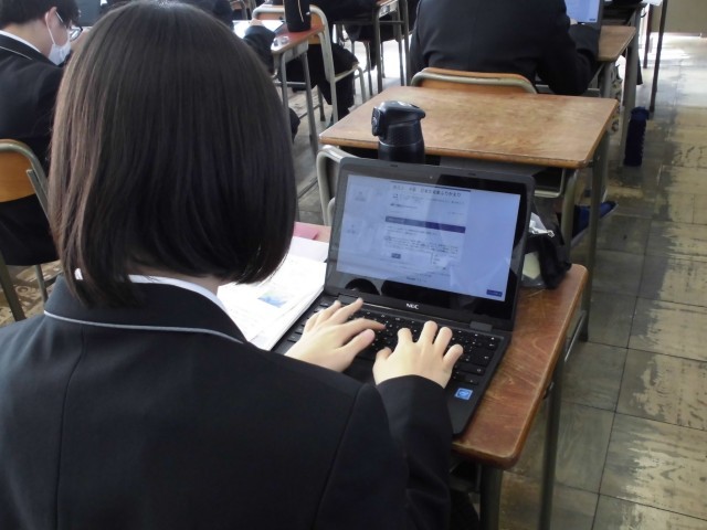 2年生の理科の授業では、単元のまとめをChromebookを使ってまとめています。また、気象現象における災害や恵みについて、スライドにまとめています。生徒たちは、とても真剣に取り組んでいます。