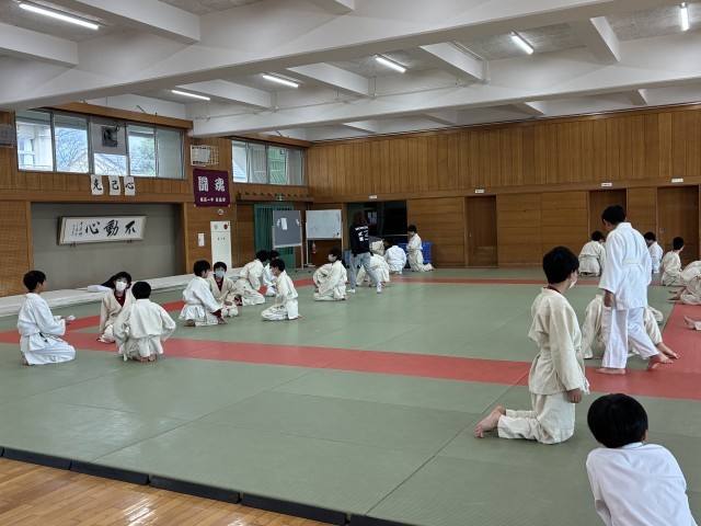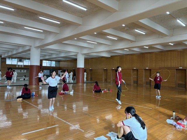 体育の授業では、男子が柔道、女子がなわとび・持久走を行っています。