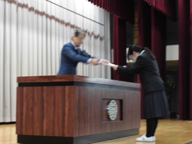 本日、体育館にて3学期始業式を行いました。校歌の伴奏者が2年生へバトンタッチして初めての式です。式の前には、校歌練習・表彰伝達を行いました。