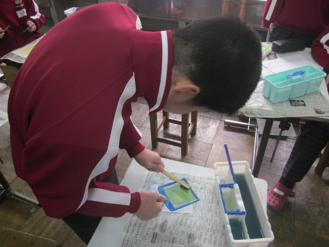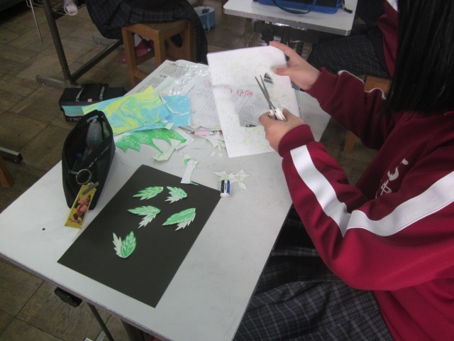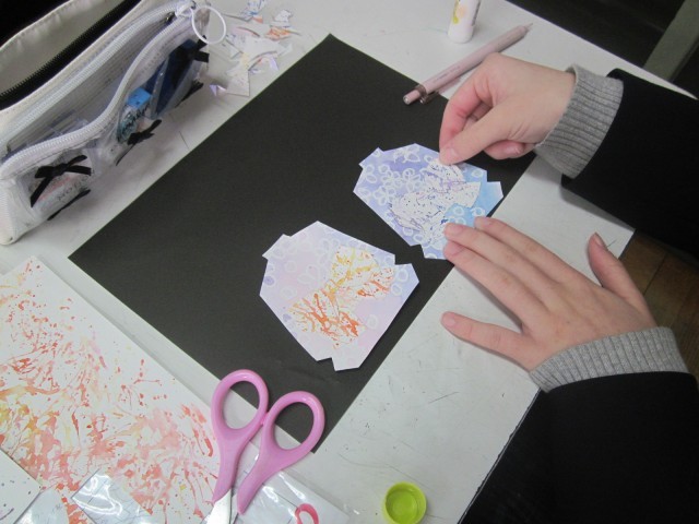 美術の時間では、絵の具でのさまざまな技法を用いてコラージュ作品をつくっています。