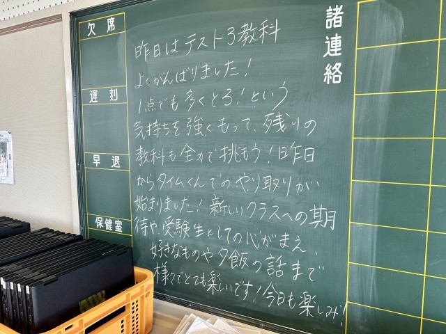 教室には、毎日担任の先生からのあたたかいメッセージが背面黒板に書かれています。明日はどんなメッセージが書いてあるかな?