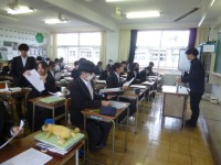 今、国語の授業では書写作品コンクールの練習に取り組んでいます。3年生は行書で「国際交流」を書いています。手本に注意点を書き込み、落ち着いて練習に取り組んでいました。