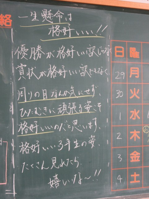 ダンスや個人種目の練習を授業の中で繰り返しがんばって練習してきました。今日は学年競争種目の練習を入場、競技、退場まで通し練習を行いました。明日は午後から予行練習です。本番に向けて「本気」になって取り組んでいきましょう。