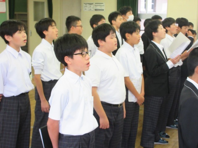 10月22日(水)合唱練習(1年生) 公開日 2025/10/23 更新日 2025/10/23 1年生 1年生の合唱練習の様子です。音源を頼りに音程をとろうとがんばっています。あと1週間で本番を迎えます。成長あるのみ!