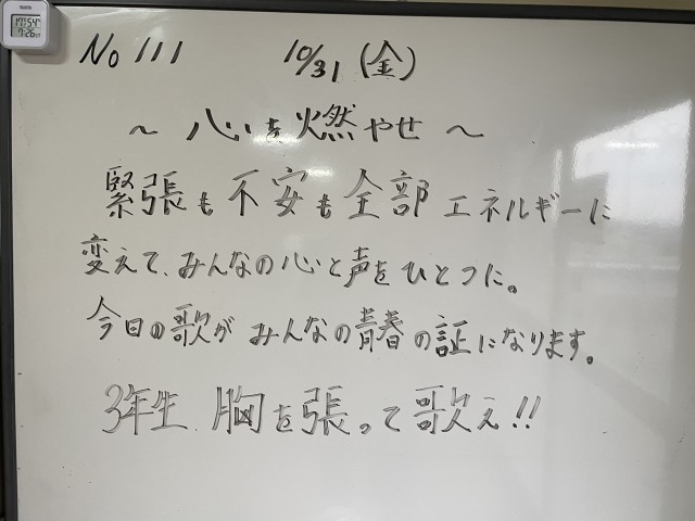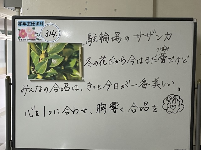 学年主任の先生や担任の先生からのメッセージがみなさんの胸に届いてくれることを信じています。今日体育館の中に、心を一つにした歌声が響くのが楽しみです。