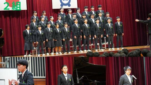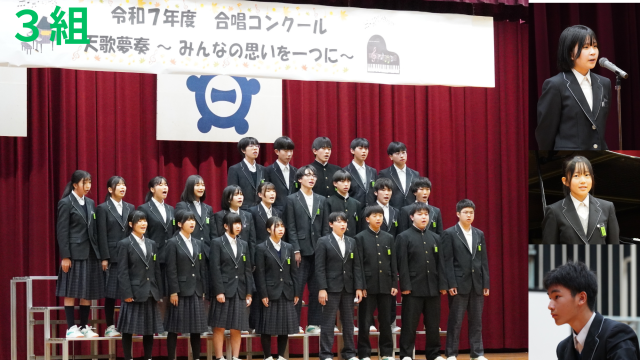 3年生の各クラスの合唱は、難しい曲ばかりでしたが、リーダーを中心に心を一つにして最高のステージをつくり上げました。練習の中でぶつかることもあったと思いますが、そのたびに話し合い、支え合いながら前へ進んできた姿に、大きな成長を感じました。