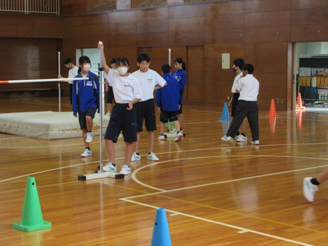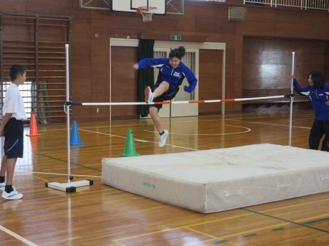 体育の授業では体育館で走り高跳びに挑戦しています。振り上げ足に意識をして高く跳ぼうという気持ちが表れています。