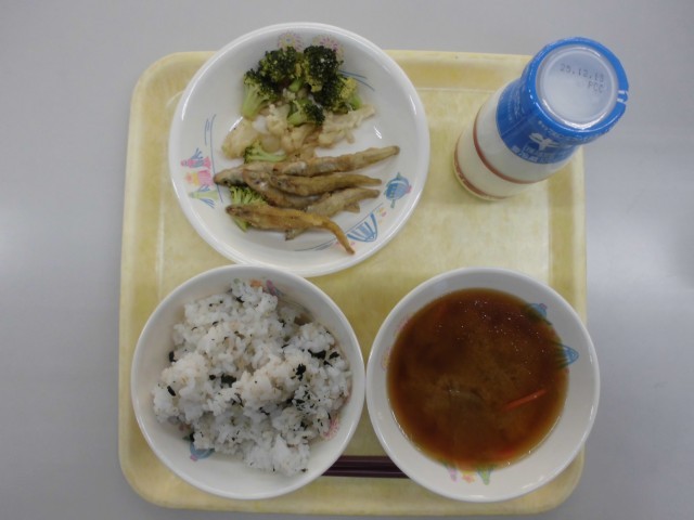 わかめご飯・牛乳・わかさぎのから揚げ・花野菜のごま和え・冬の根菜豚汁
