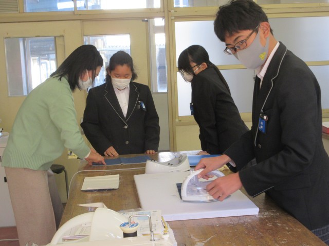 アイロンをかけたり、ミシンで縫ったりと進度は違えど、協力して教えあいながら進めました。
