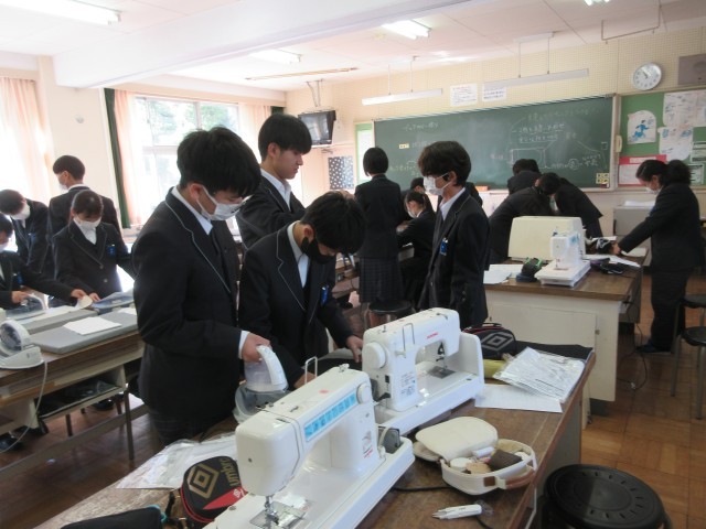 被服室をのぞいてみると、2年2組の家庭科の授業を行っていました。どうやら「ブックカバー」の製作をしているようです。