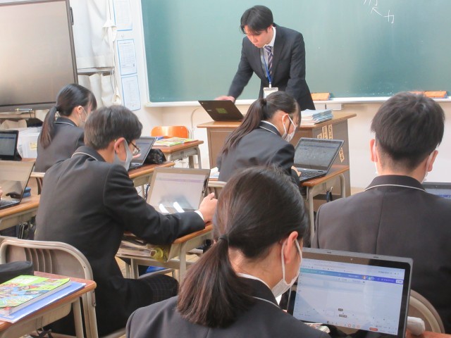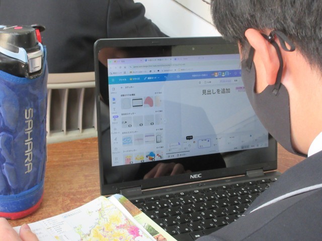 社会科の授業では、各自端末を使って中部地方、近畿地方などの産業の特色についてまとめていました。