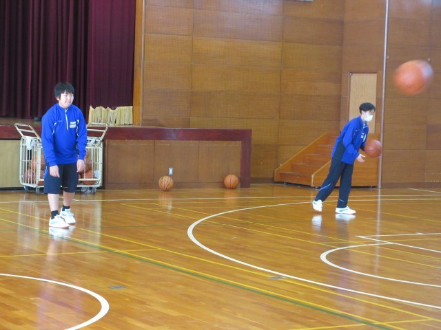 体育の授業ではバスケットボールが始まりました。チェストパスは足を送り出し、うまく回転をかけると相手が取りやすくなります。繰り返し練習に取り組みました。