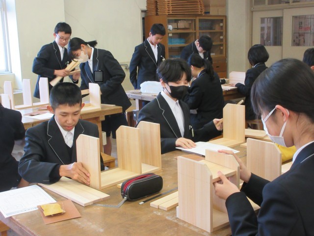 技術の時間では本棚の製作をしています。くぎ穴をあけたり、けがきをしたりするなど自分のペースで丁寧に作業をしています。がんばれ1年生!
