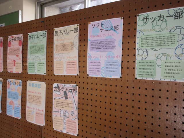 昇降口をみてみると、部活動の紹介や抱負が書かれた掲示物が貼られていました。7月の最後の大会まで5カ月を切っています。テストが終わったら、また部活動が再開します。がんばっていきましょう。