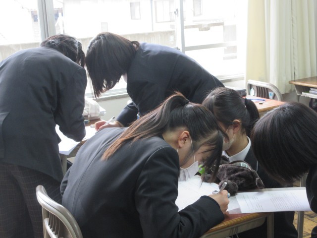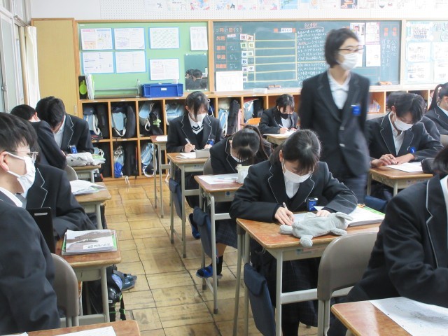 数学の授業で、水曜日に行われた公立一般入試に出題された問題を解いていました。1・2年生の中から出題されている部分もあり、周りと学んできた既習事項を思い出しながら解決をしようとがんばっていました。