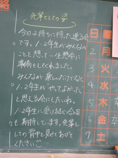 3年生のみなさんが1・2年前に先輩に同じように感謝の気持ちを表してきましたから。今度は自分に返ってくる・・・今週残り3日。先輩としての姿を見せてください。