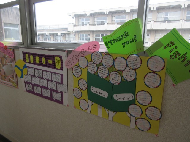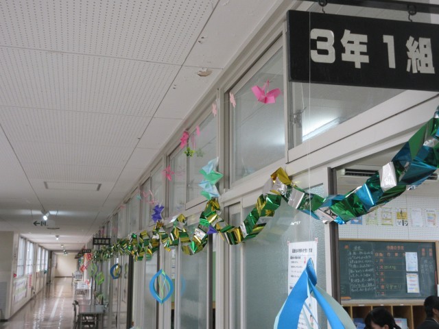 3年生の廊下にはさまざまな飾りつけがされています。今日の卒業生を送る会や卒業式に向けて、1・2年生が雰囲気を作ってくれています。