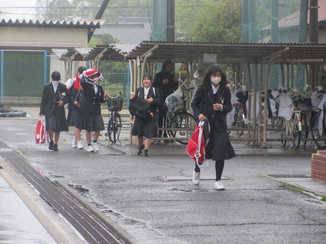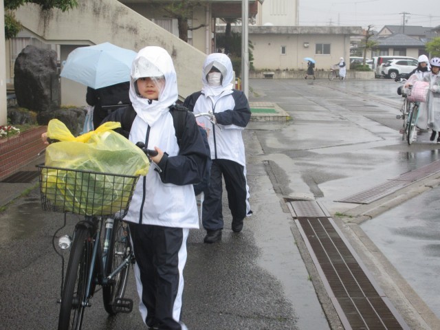 慣れない自転車、重いバッグ、そして雨合羽。苦労しながらもペダルを漕いで校門をくぐる生徒たちの姿は、とてもたくましく見えました。