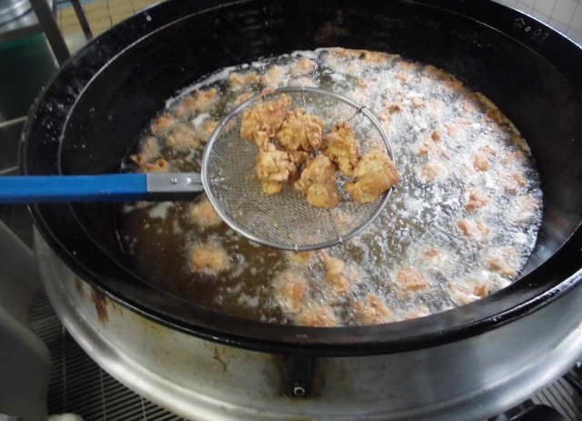 今日の給食は、進級・進学をお祝いして、生徒の大人気「鶏のから揚げ」を献立に入れました。調理室では、鶏肉に下味をつけ、中はジューシー、外はかりっと揚がるように、片栗粉を一つ一つ丁寧につけて作業をしました。片栗粉の付け方で、出来上がりが大きく変わってきます。もちろん、中心温度も基準を守って揚げています。副菜の「じゃがいものきんぴら」は、旬の新じゃがを使用して、シャキシャキ食感のきんぴらに仕上げました。