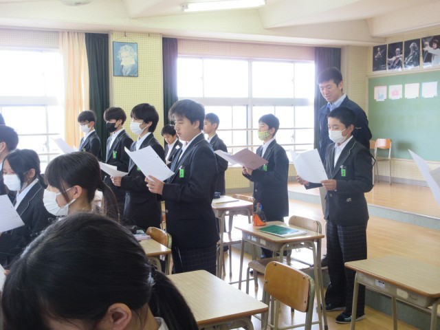 音楽の授業では、母校の校歌を学んでいます。音程を意識して繰り返し繰り返し練習し、自信をもって歌えるといいですね。
