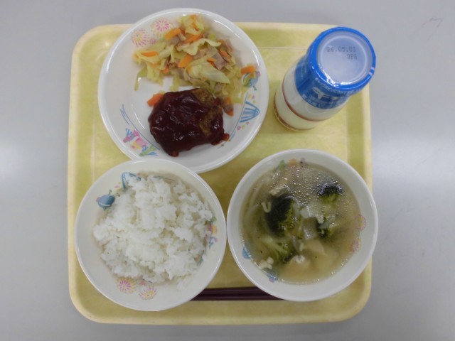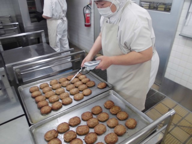 今日の主菜は、「ハンバーグのケチャップソース」でした。給食室では、ハンバーグの中心の温度が85℃以上1分あるか、中心温度計で計測して出します。ソースも調理室で作り、中心温度を計測して出します。子どもたちから、ハンバーグとソースの相性がよかったですというコメントがありました。