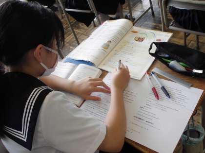 5月25日(水) 接続詞「that」の学習(2年生) 公開日 2022/05/25 更新日 2022/05/25 2年生 今日は「〇〇は〜と思っている」「〇〇は〜と願っている」などを,英語で表現する方法として,接続詞「that」を使って表すことを学びました。教科書の本文や,例文を考えることで自分の言葉として使えるように高めていきます。