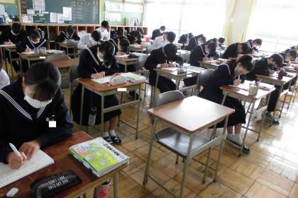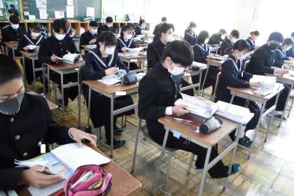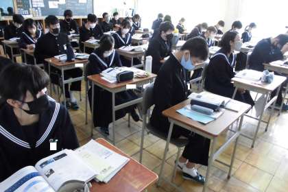 3年生の2時間目の様子です。いよいよ来週月曜日,火曜日に期末テストが迫ってきました。数学,理科,国語の授業でも,テストで自己ベストを出せるように自分なりに努力する姿が見られました。焦らず,自分にできることを一つ一つ行っていけるといいですね。頑張れ,3年生!