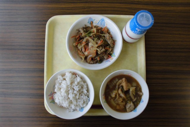 今日の献立は、牛乳、麦ご飯、豚丼(具)、石狩汁 です。