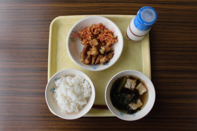 今日の献立は、牛乳、ご飯、白身魚の甘辛レモンがらめ、にんじんシリシリー、もずくスープ です。