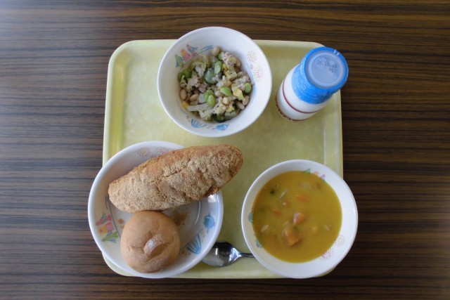 今日の献立は、牛乳、きなこ揚げパン、プチパン、まめまめサラダ、かぼちゃのポタージュ です。