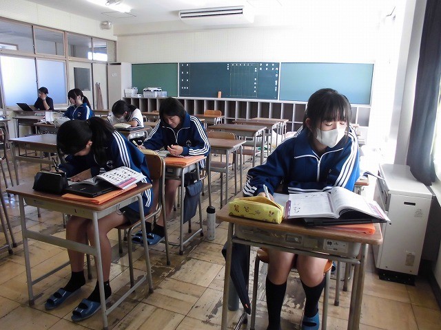 1枚目は3組男子の体育、2枚目は3組女子の保健体育、3枚目は1組の授業の様子です。14日の4科テストに向けて、学習に取り組んでいます。